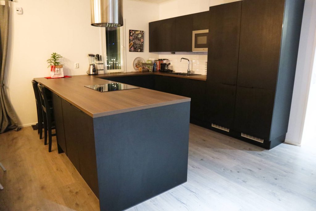 Keittiö on emännän sydän, ja lähes kokonaan hänen käsialaa. Taloon haluttiin ehdottomasti musta keittiö ja aika helposti saatiin valittua keittiön pintamateriaalit. Laskutilaa on todella paljon, ja saarekkeelle voi vieras istua kahville tai lapset välipalalle läksyjen kanssa samalla kun emäntä tai isäntä tekee ruokaa.