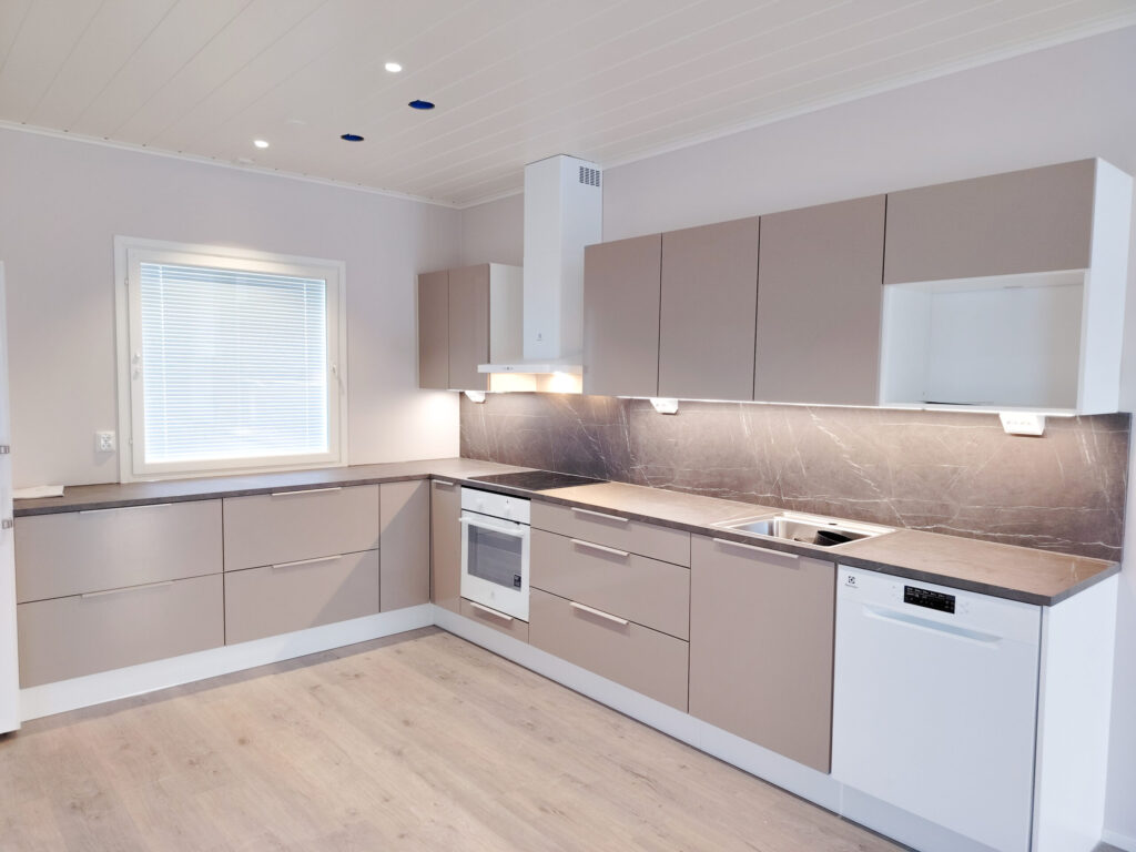 Sisustusvalintojen tueksi perhe hyödynsi paikallista K-Rautaa ja varasi ajan Puustellille kiintokalusteiden valintaa varten.