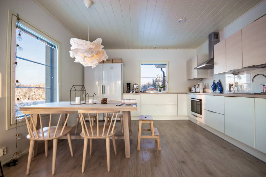 Kun tontti oli löytynyt, talomallin valinta oli suhteellisen helppoa. Halusimme pulpettikattoisen, modernin talon, joka sopi esteettisesti kauniisti tänne korkealle metsämaisemaan. Pohjaratkaisuun halusimme avaran keittiö-olohuoneyhdistelmän, toimivan kodinhoitohuoneen ja kaksi tilavaa makuuhuonetta pienen perheemme tarpeisiin.