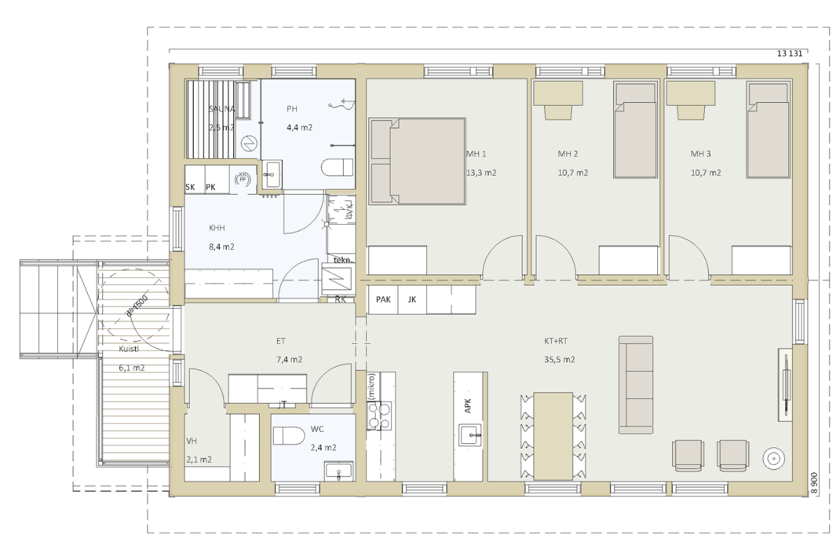 Tähän talomalliin on saatavilla useita erilaisia julkisivuverhoiluja ja lämmönlähteeksi voit valita esimerkiksi maalämmön tai poistoilmalämpöpumpun. Terassin ja tulisijan sijainti on myös vapaasti valittavissa oman toiveesi mukaan. Tutustu lisää talomalliemme yksilöinti- ja muokkausmahdollisuuksiin talomallien muokattavuus ja lisävalinnat osiostamme!