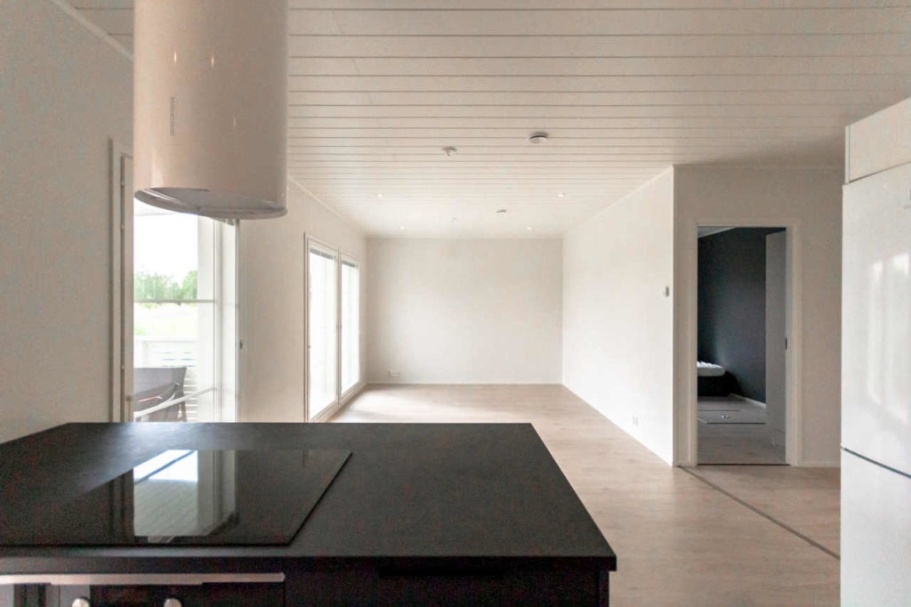 Tontin ollessa kooltaan alle 500m2 Järviset päättivät valita Muurametalojen pienimmän mallin – Vanamo 98:n pohjaratkaisulla C:n. Talo saatiin sijoitettua mukavasti tontille, ja sijoittamalla isot ikkunat etelän suuntaan pienten neliöiden kotiin saatiin runsaasti tilan tuntua. Lisävalintana kodin takapihalle he valitsivat talopakettiinsa 5,9×2,5 metrisen katetun terassin, joka toimii myös olohuoneen jatkeena. Kodinhoitohuoneen liukuovien taakse on piilotettu talotekniikka ja pyykkihuolto. ”Nelihenkiselle perheelle neliöt riittävät hyvin, ja talo tuntuu neliöitään suuremmalta avokeittiön ansiosta. ” Järviset toteavat.